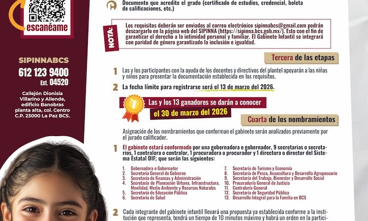 Villa Urías mencionó que la convocatoria puede consultarse en las páginas web sipinna.bcs.gob.mx, sgg.bcs.gob.mx, en las redes sociales del Gobierno del Estado o comunicándose al 612 123 94 00, extensión 04520.